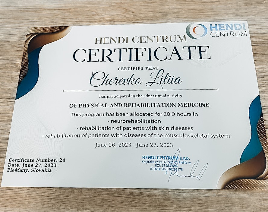 👩🏻⚕️ Лілія Олексіївна Черевко – лікар фізичної та реабілітаційної медицини пройшла міжнародне медичне стажування з реабілітації у Hendi Centrum – intenzívna rehabilitácia в Словаччині.