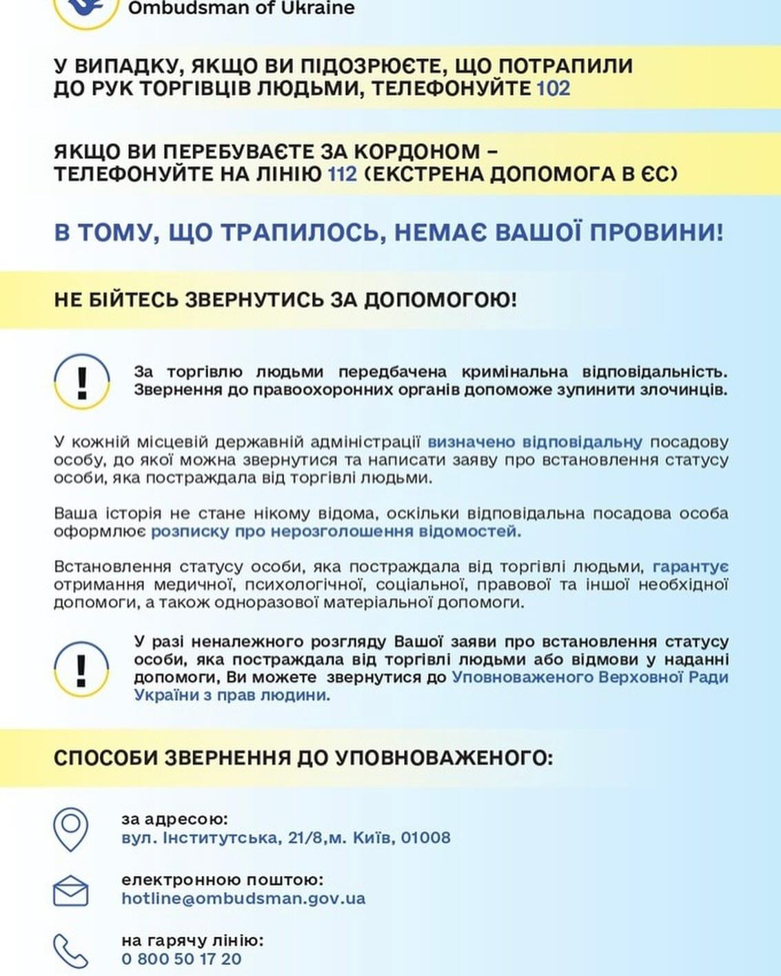 Ми закликаємо всіх звернути власну увагу та поширювати інформаційні матеріали про алгоритми дій у випадках торгівлі людьми. Щоб бути готовими діяти та убезпечити себе й своїх близьких!